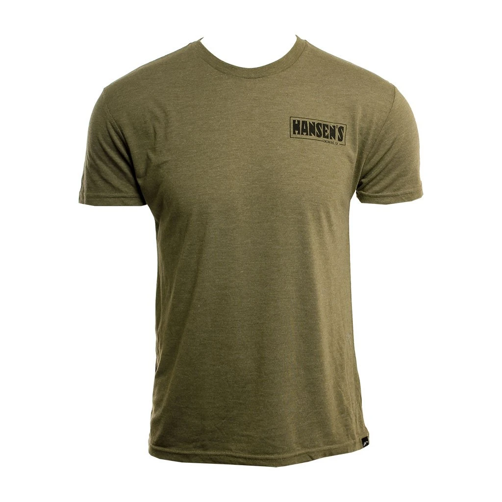 Our old logo has been dusted off and slapped on a soft not starchy cotton blend tee. Small screenprint on left chest, large on back50% polyester 25% cotton 25% rayon / Mens Shirt Old School in Army / Small / Cotton/ Polyester / Hansen