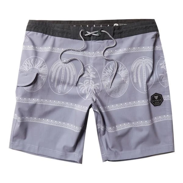 Archaic sun and palm styled surf trunk. A 4- Way stretch boardshort made with coconut and recycled poly Repreve fibers to help you sustain the vibe. Featuring an engineered print with solid waistband, side seam pocket and integrated key rope. 18.5″ outseam.36% Polyester From Coconut 34% Recycled Polyester 20% Cotton 10% Spandex / Mens Boardshorts La Palmba 18.5″ in Lilac / 28 / Cotton/ Polyester/ Spandex / Vissla